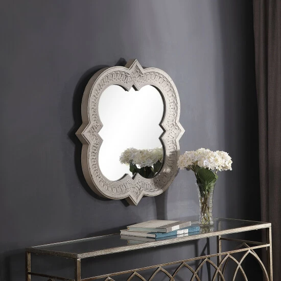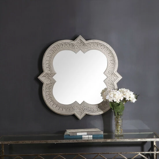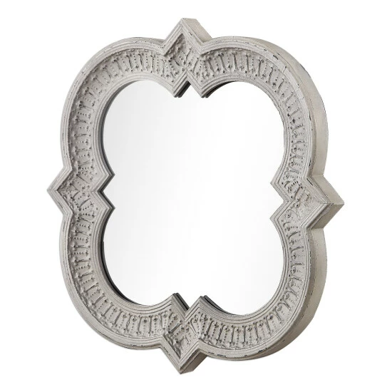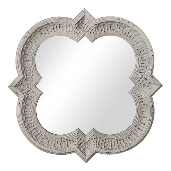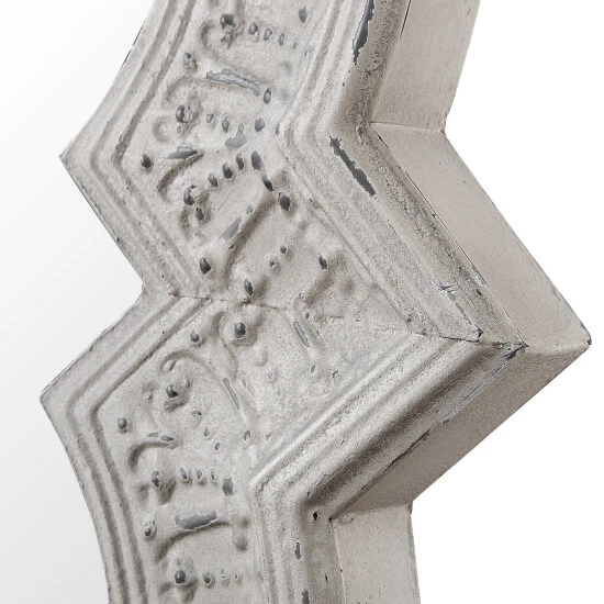 With an embossed metal frame in a whitewash finish, this mirror delivers distinctive art. The distressed details offer an antique look for the perfect complement to country decor.