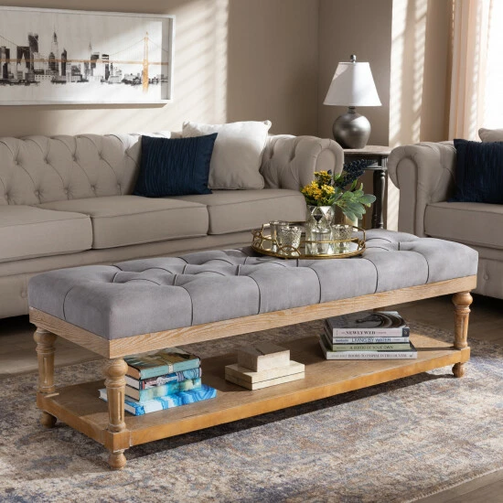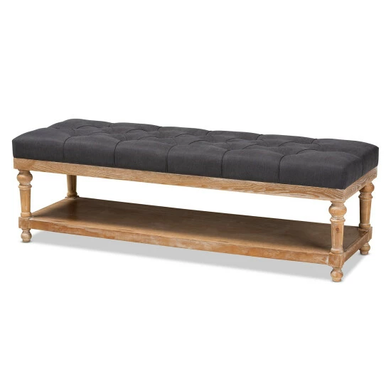 Add a touch of sophisticated grace to your home with this bench. Made in Malaysia, this bench is fitted with a lower storage shelf made out of grey washed wood to hold shoes, decorations, or supplies. Padded with foam for the utmost comfort, this bench is upholstered in linen fabric and enhanced with elegant button tufting.
